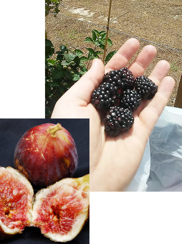 We also grow Persimmons, Grapes, Blackberries, Pears, and Brown Turkey Figs. Our farm animals include Osceola Turkeys, Peacocks, Pekin & Muscovy Ducks.