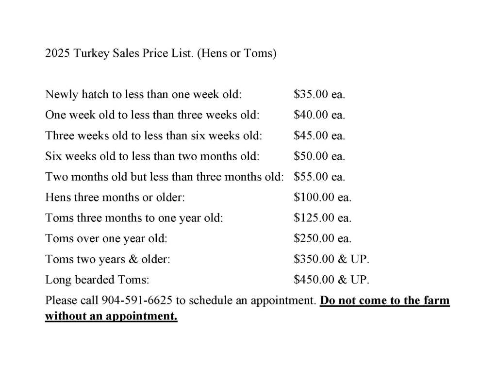 Our pen raised hybrid Osceola turkeys are for sale (Live Only) we will not kill our turkeys; customers may purchase one or as many as they wish. Prices are determined by the sex and age of the turkey.