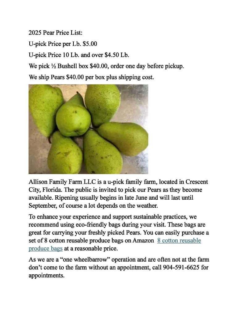 At Allison Family Farm, our pear orchards are a cherished part of our land, producing sweet, juicy pears that are perfect for fresh eating, baking, and preserving. Grown with care using sustainable farming practices, our pears are known for their rich flavor, crisp texture, and farm-fresh quality.